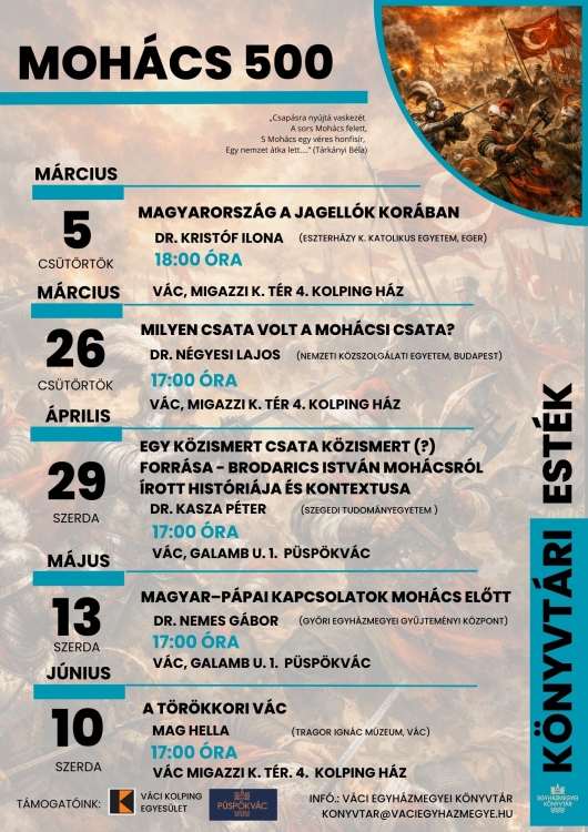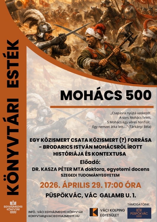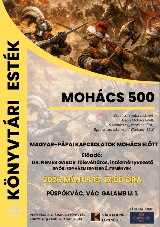 A mohácsi csata 500. évfordulója alkalmából a Váci Egyházmegyei Könyvtár előadássorozattal emlékezik meg történelmünk egyik legmeghatározóbb eseményéről. A Mohács 500 című Könyvtári Esték nemcsak a korszak általános történeti kérdéseit tekintik át, hanem külön figyelmet fordítanak a Váci Egyházmegye múltjával és szerepével való kapcsolódásokra is.